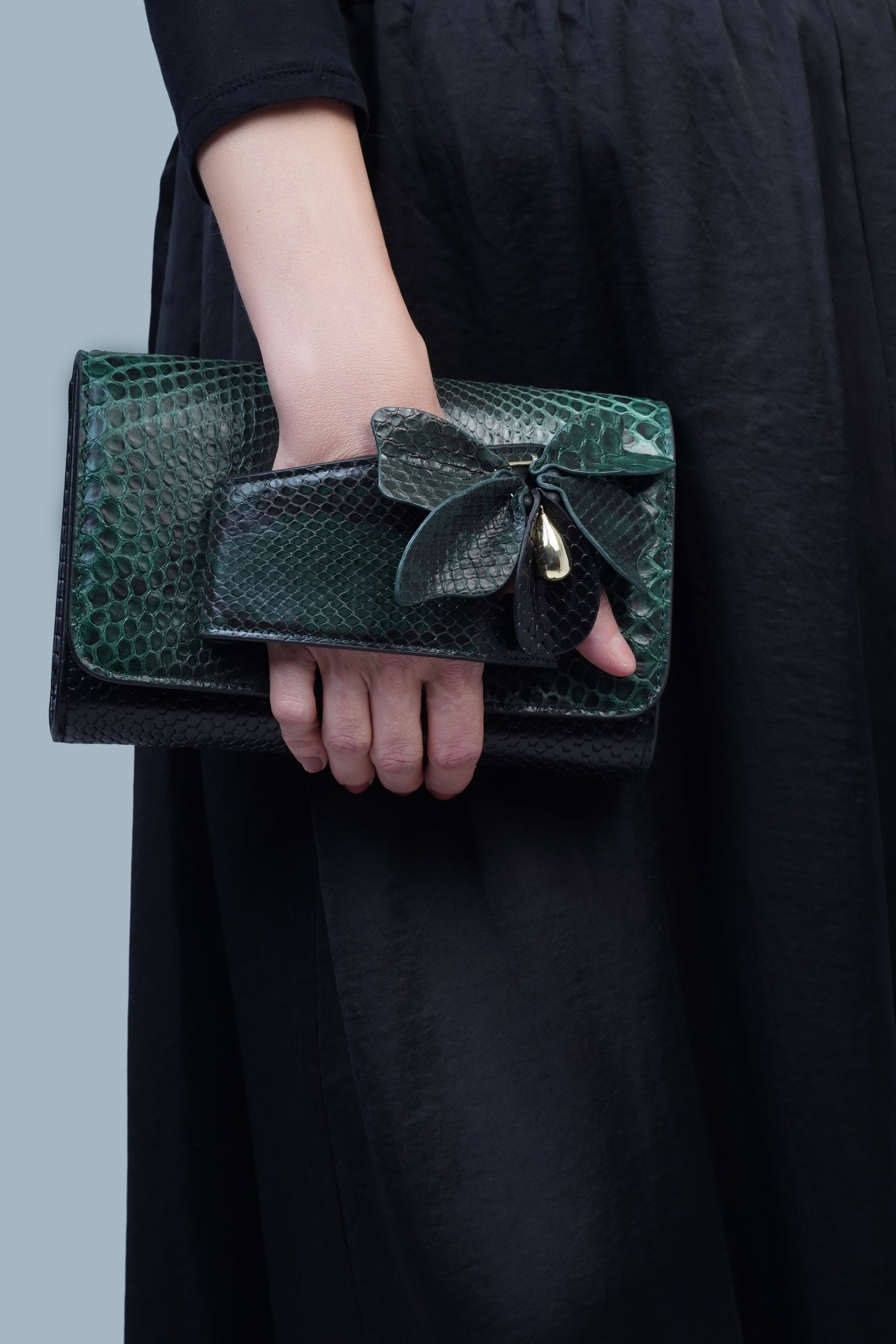 Designed with inspiration from nature, this bag attracts attention with its elegant and romantic elegance. The design on its cover is enriched with organic forms reminiscent of both a butterfly and flower petals. Details resembling flower petals are supported by metal plates, creating a three-dimensional effect and adding artistic depth to the design. Prepared with the harmonious combination of python leather and calfskin in tone-toned colors, this design brings together naturalness and luxury. The handmade gold-plated brass drop detail in the middle creates a feminine and elegant focal point, while placing a sophisticated emphasis on the center of the design.